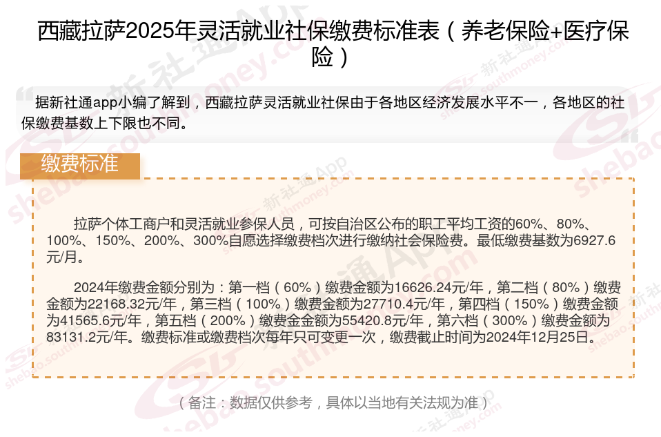 据新社通app数据显示,西藏拉萨灵活就业人员养老保险缴费基数2024-2025年最新标准如下: