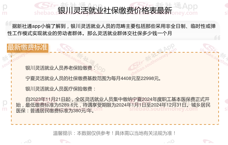 据新社通app数据显示,银川灵活就业养老保险的缴费基数为:5070元。灵活就业人员参保缴费的比例为个人20%。