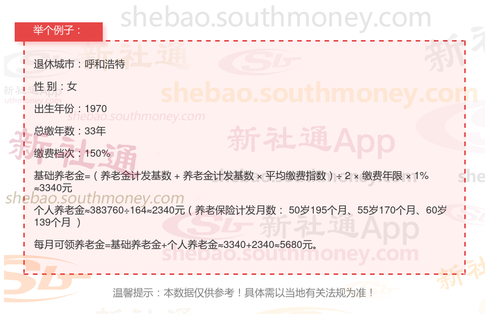 退休城市:呼和浩特,性别:女,出生年份:1970,总缴年数33年,缴费档次:150%
