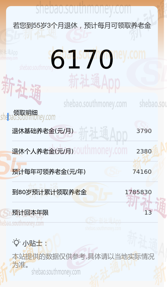 每月养老金总额 = 3790元 + 2380元 = 6170元。