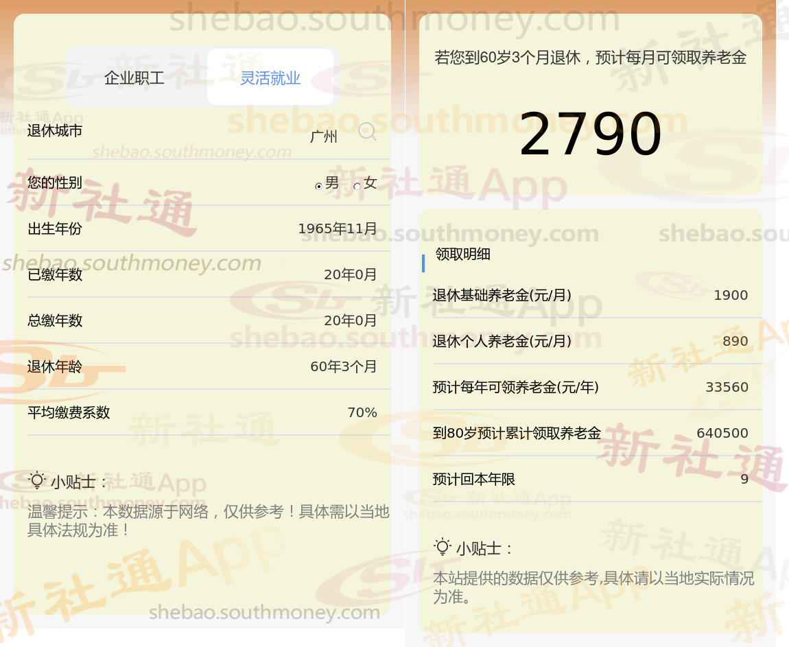 朋友康某退休城市在广东广州,性别:男,出生年份:1965,总缴年数20年,缴费档次:70%,新社通app养老金计算器所得: