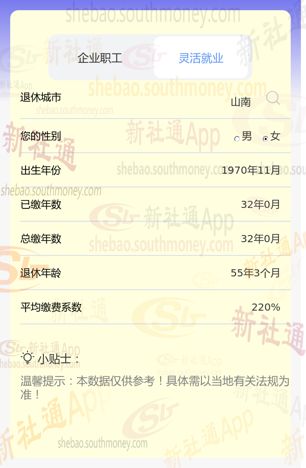 笔友希某退休城市在山南,性别:女,出生年份:1970为例,假设其按最低标准(缴费系数0.6)缴纳社保,新社通app养老金计算器预设工资增长率等参数为3%。在此情境下,其退休后能领取的养老金数额需通过计算器精确得出,但基于上述条件,预计数额会相对较低。为获准确估算,建议希某使用计算工具按要求输入个人信息进行计算,具体数额依个人情况及当地法规而定。