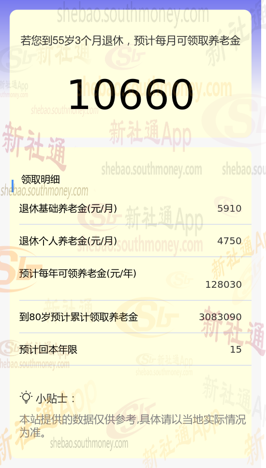 新社通app养老金计算器计算所得: