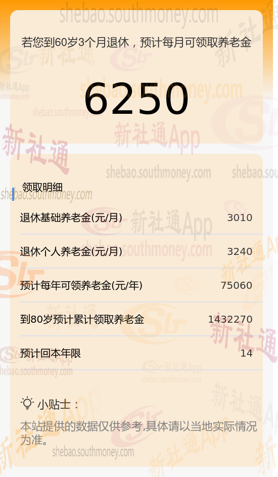 谢某,1965年出生于南宁,是一位拥有22年社保缴费记录的退休职工,缴费档次为300%。辛勤工作多年后,他迎来了退休生活。通过新社通app养老金计算器计算所得,谢某得知自己每月可以领取到基础养老金约3010元,加上个人养老金约3240元,总计6250元。虽然金额不算多,但对于谢某来说,这是一份稳定的收入来源,为他的退休生活增添了一份安心与保证。