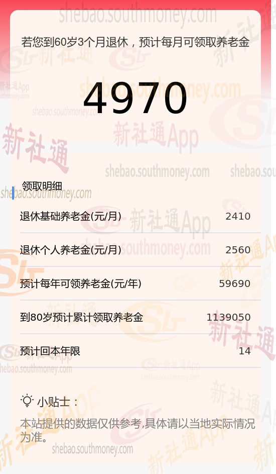 总养老金待遇:每月可领取的养老金待遇总额为2410元+2560元=4970元/月。