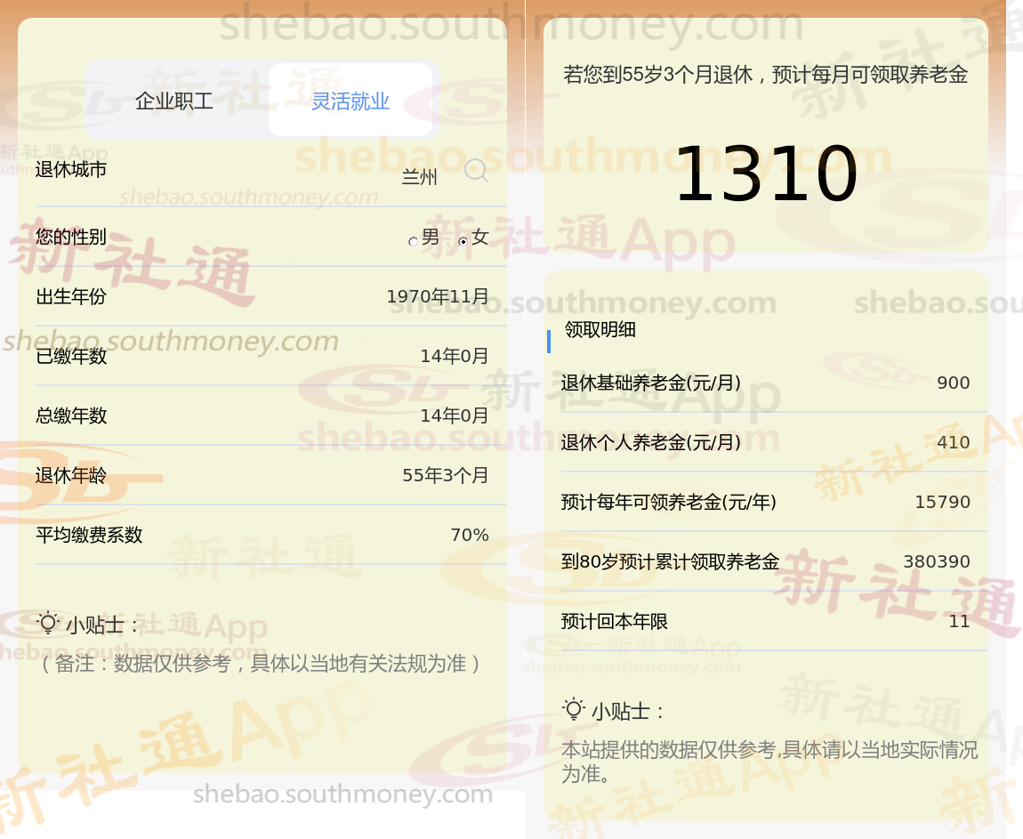 退休城市:兰州,性别:女,出生年份:1970,总缴年数14年,缴费档次:70%,新社通app养老金计算器所得: