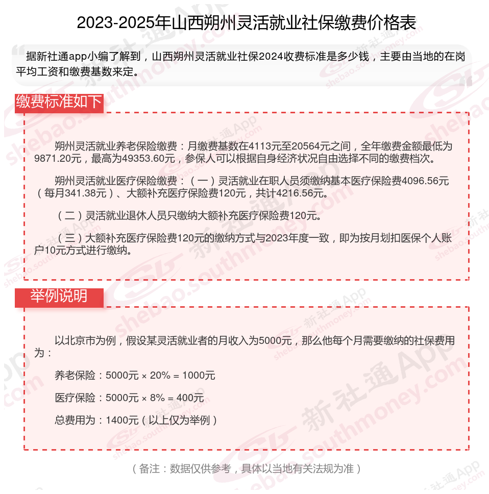 据新社通app数据显示,山西朔州灵活就业养老缴费基数明细如下: