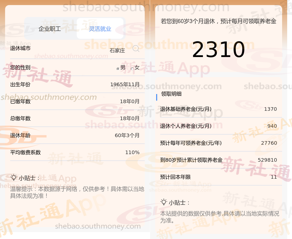 退休城市:石家庄,性别:男,出生年份:1965,总缴年数18年,缴费档次:110%,新社通app养老金计算器所得: