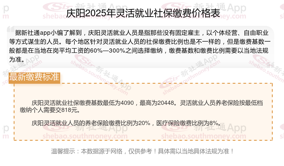 庆阳灵活就业自己交社保一个月要交多少钱?根据新社通app-社保缴费查询工具提供的最新数据如下:
