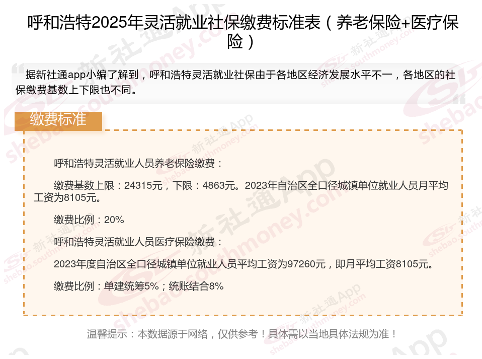 据新社通app数据显示,2024-2025年呼和浩特灵活就业人员养老保险的缴费标准: