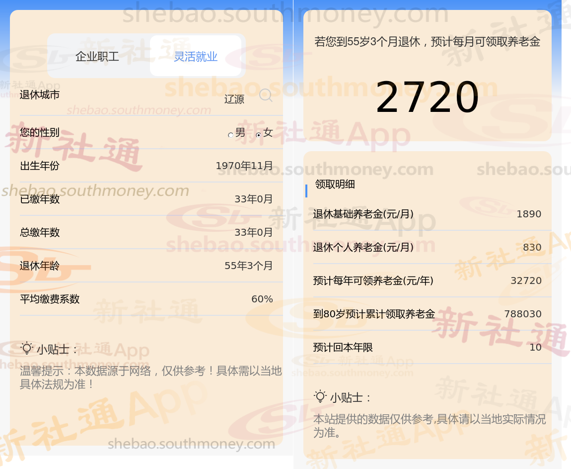 基础养老金估算:在综合考量各项因素后,基础养老金的测算金额为1890元。