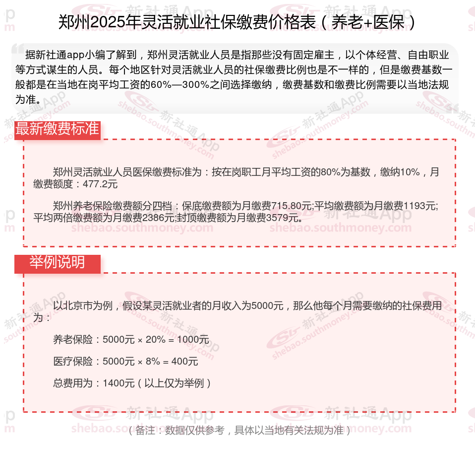 据新社通app数据显示,郑州灵活就业养老保险的缴费基数为:3579元。灵活就业人员参保缴费的比例为个人20%。