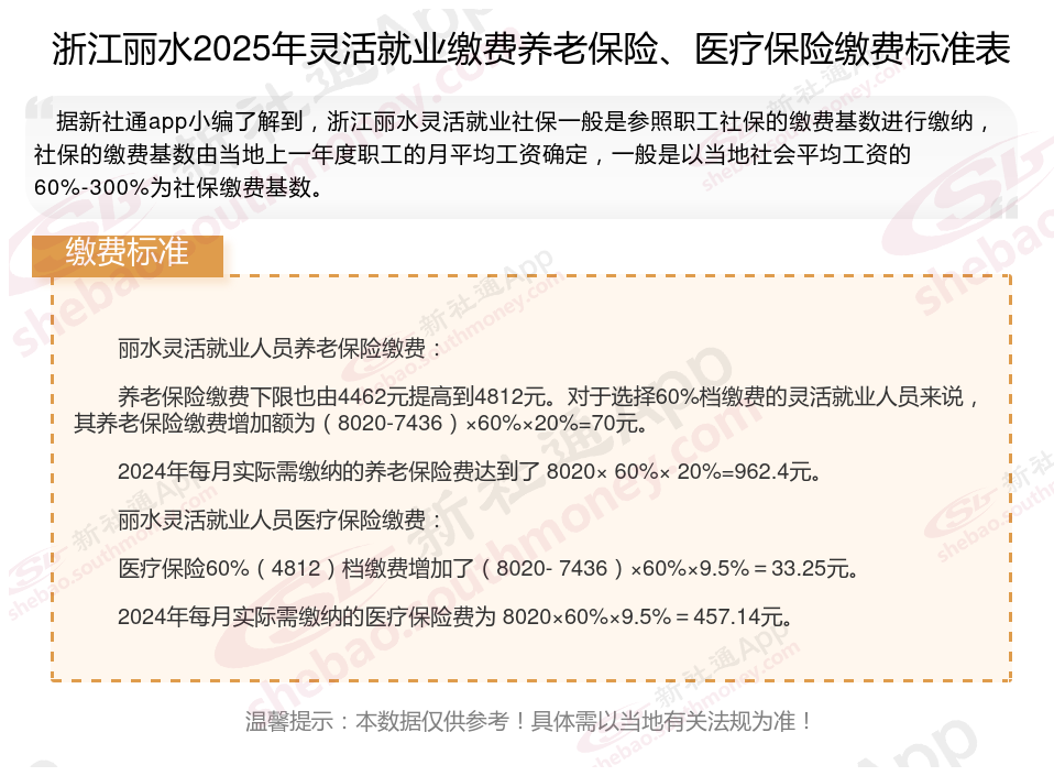 据新社通app数据显示,浙江丽水灵活就业人员养老保险缴费基数2024-2025年最新标准如下: