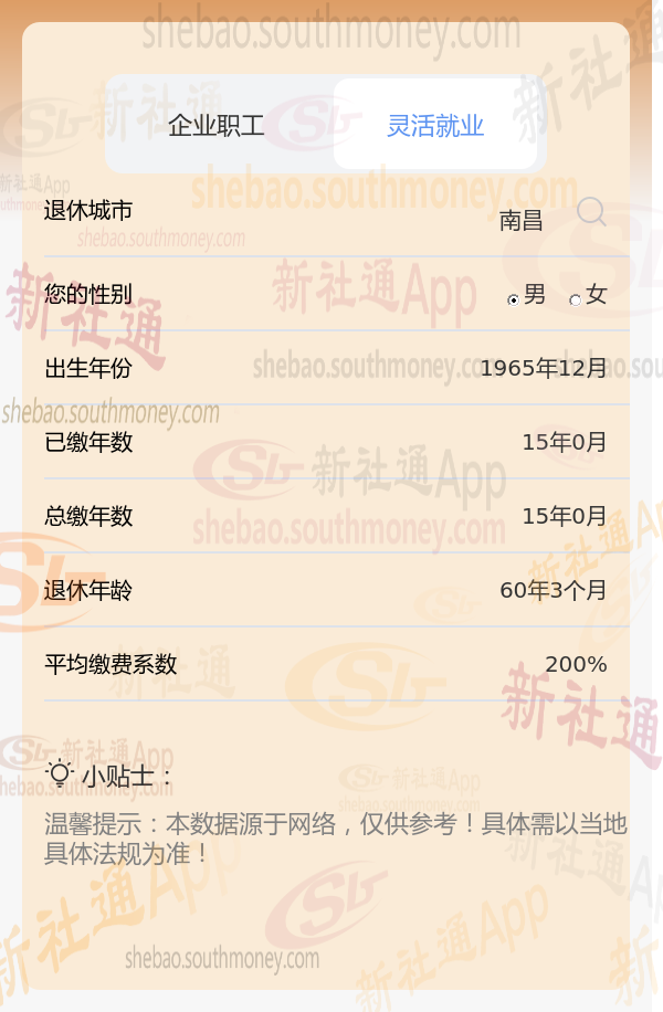 和新社APP一起看个例子,江西南昌工龄15年养老退休金如何计算?
