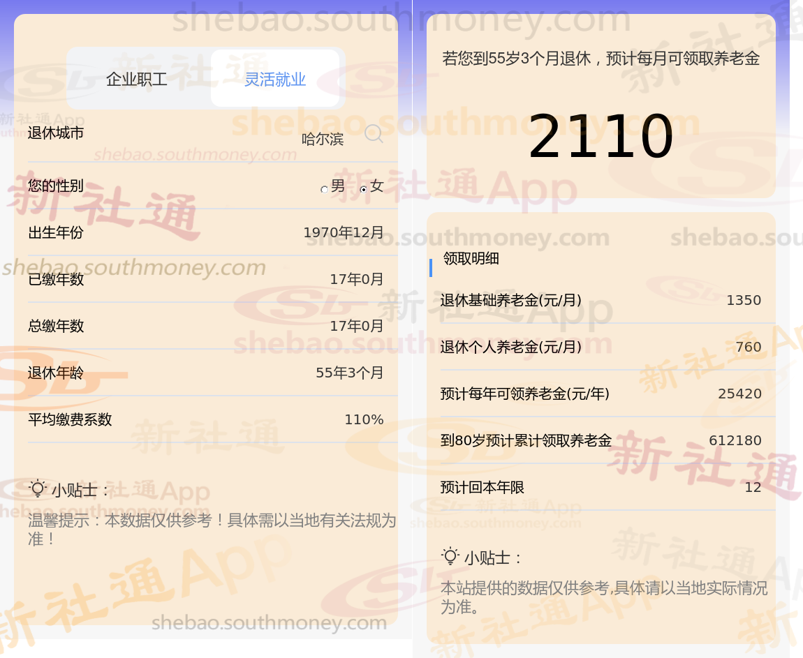 退休城市:黑龙江哈尔滨,性别:女,出生年份:1970,总缴年数17年,缴费档次:110%,新社通app养老金计算器所得: