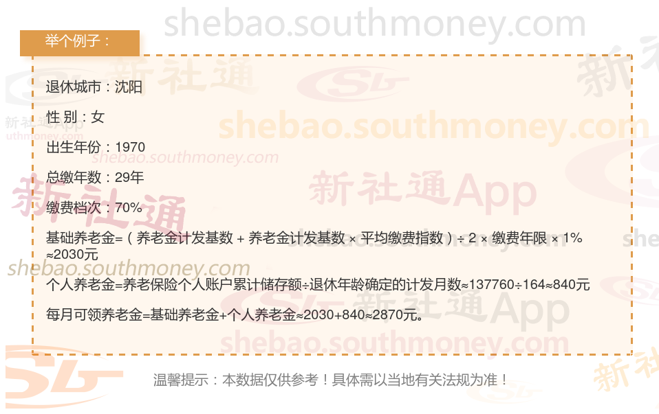 亲戚王某退休城市在沈阳,性别:女,出生年份:1970,总缴年数29年,缴费档次:70%,新社通app养老金计算器所得: