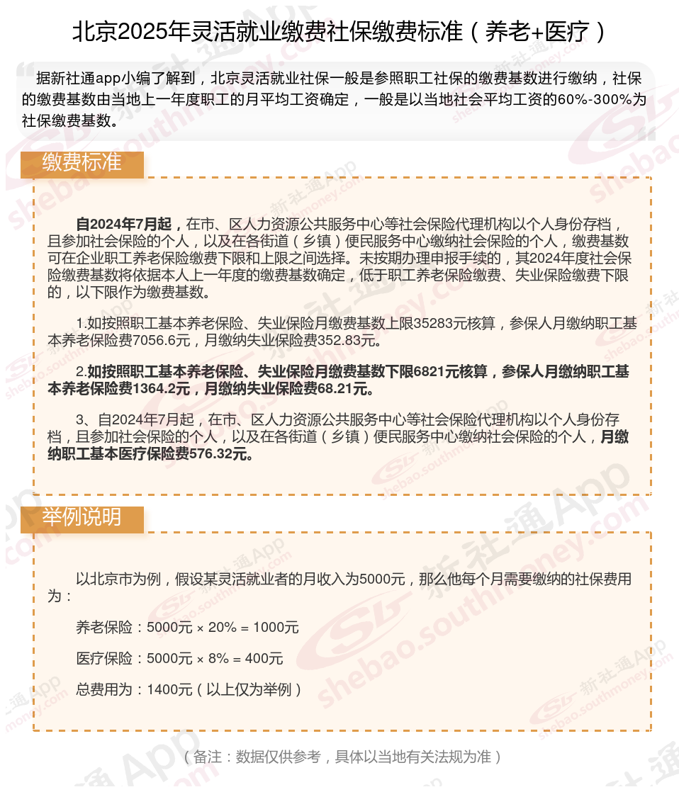据新社通app数据显示,北京灵活就业人员养老缴费基数2024-2025年最新标准如下: