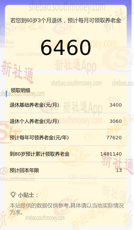 结果显示:他每月可以从个人账户中领取约3060元的养老金。将上述两部分相加,我们得出王某每月预计可以领取的养老金总额为6460元。这一结果是由新社通app养老金计算器基于给定的参数和公式得出的估算值。