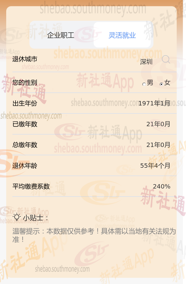 以深圳1971年女性王某为例,假设其按最低标准(缴费系数0.6)缴纳社保,新社通app养老金计算器预设工资增长率等参数为3%。在此情境下,其退休后能领取的养老金数额需通过计算器精确得出,但基于上述条件,预计数额会相对较低。为获准确估算,建议王某使用计算工具按要求输入个人信息进行计算,具体数额依个人情况及当地法规而定。