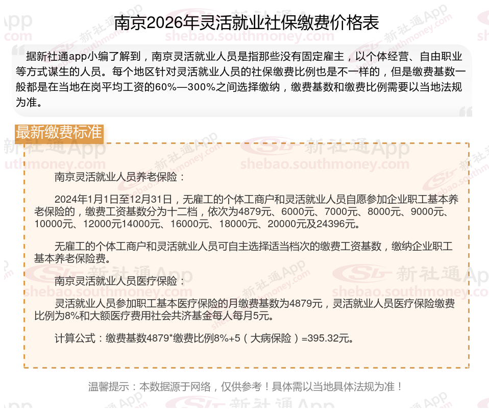 灵活就业者缴纳社会保险,一般需要交多少钱一个月?根据新社通app-社保缴费查询工具提供的2026社保缴费标准详情数据: