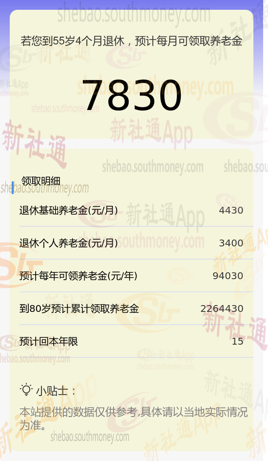 每月可领养老金总额:将基础养老金与个人养老金相加,每月可领取的养老金总额约为7830元(4430元+3400元)。