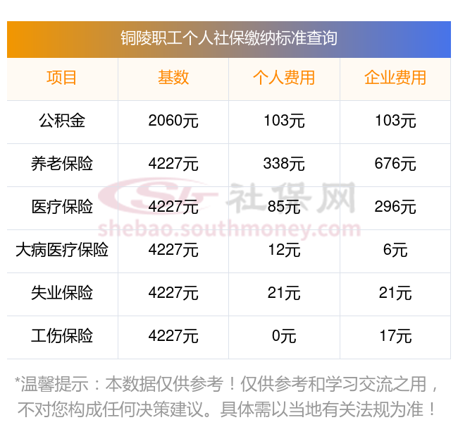 2024年铜陵社保缴费多少钱?下表是2023-2024年铜陵社保费用明细参考,新社通app-社保缴费查询工具提供的最新数据如下: