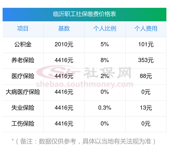 2024年临沂社保缴费多少钱?下表是2023-2024年临沂社保费用明细参考,新社通app-社保缴费查询工具提供的最新数据如下: