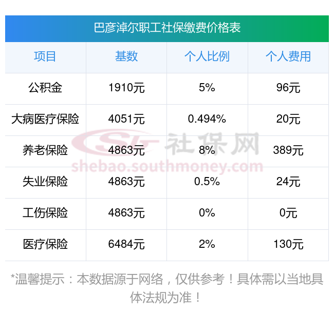2025年巴彦淖尔社保缴费多少钱?下表是2024-2025年巴彦淖尔社保费用明细参考,新社通app-社保缴费查询工具提供的最新数据如下: