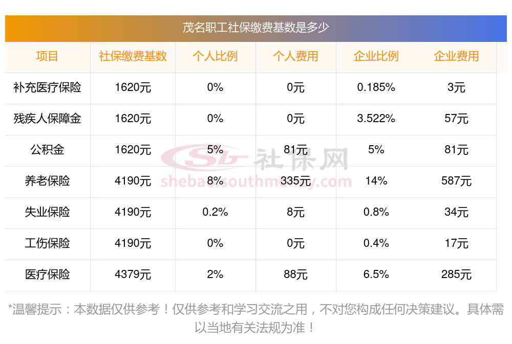 茂名缴费社保比例一览 社保公司和个人各交多少?下表是2024-2025年茂名社保费用明细参考,新社通app-社保缴费查询工具提供的最新数据如下:
