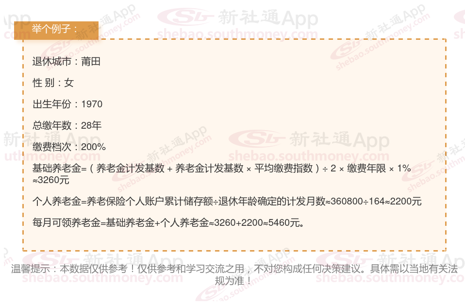 秦某,莆田人,1970年出生,是一名拥有28载社保缴费年限的退休女性,缴费档次稳定在200%。岁月流转,她终于迎来了自己的退休时光。借助新社通app养老金在线计算器计算所得: