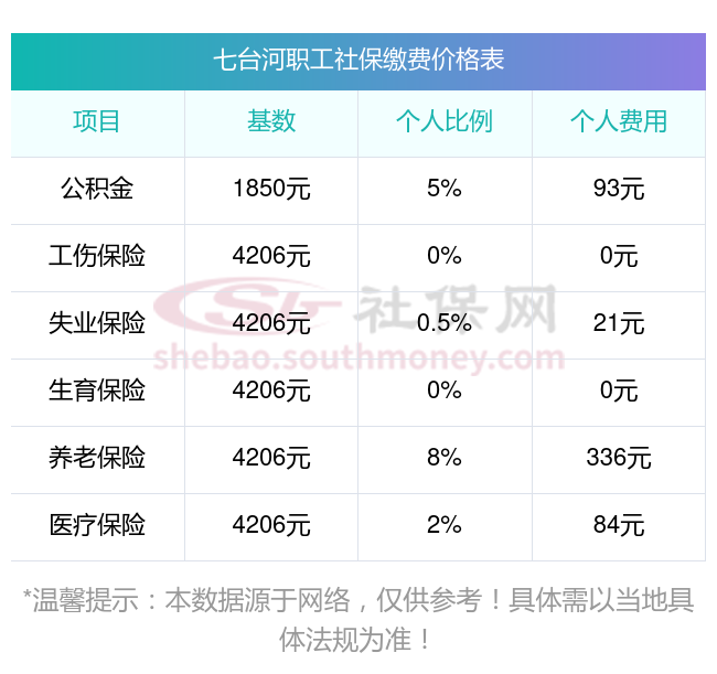 2025年七台河社保缴费多少钱?下表是2024-2025年七台河社保费用明细参考,新社通app-社保缴费查询工具提供的最新数据如下: