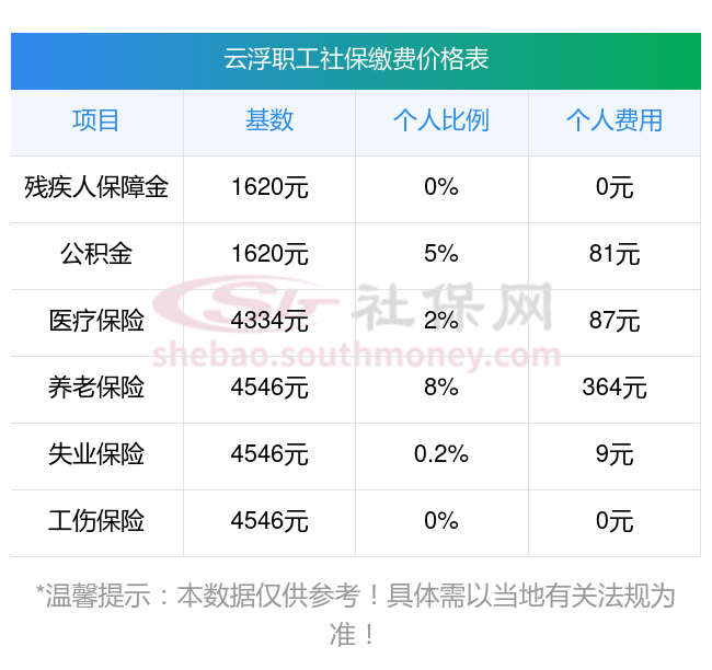 2025年云浮社保缴费多少钱?下表是2024-2025年云浮社保费用明细参考,新社通app-社保缴费查询工具提供的最新数据如下:
