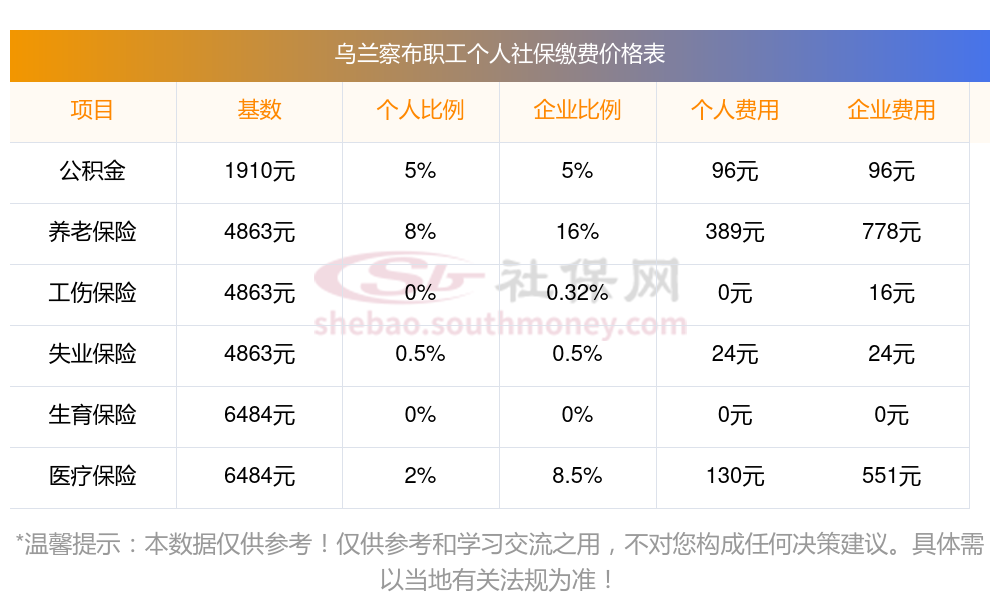社保缴纳比例一览,社保公司和个人各交多少?下表是2023-2024年乌兰察布社保费用明细参考,新社通app-社保缴费查询工具提供的最新数据如下: