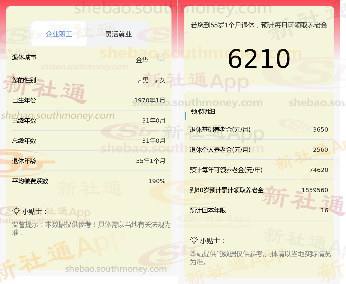 林某,金华人,1970年出生,是一名拥有31载社保缴费年限的退休女性,缴费档次稳定在190%。岁月流转,她终于迎来了自己的退休时光。借助新社通app养老金计算器计算所得,林某惊喜地发现,她每月可以领取到基础养老金大约3650元,再加上个人养老金约2560元,两项合计,她每月的养老金总额达到了6210元。虽然数额不大,但足以让她的退休生活充满温馨与安宁。