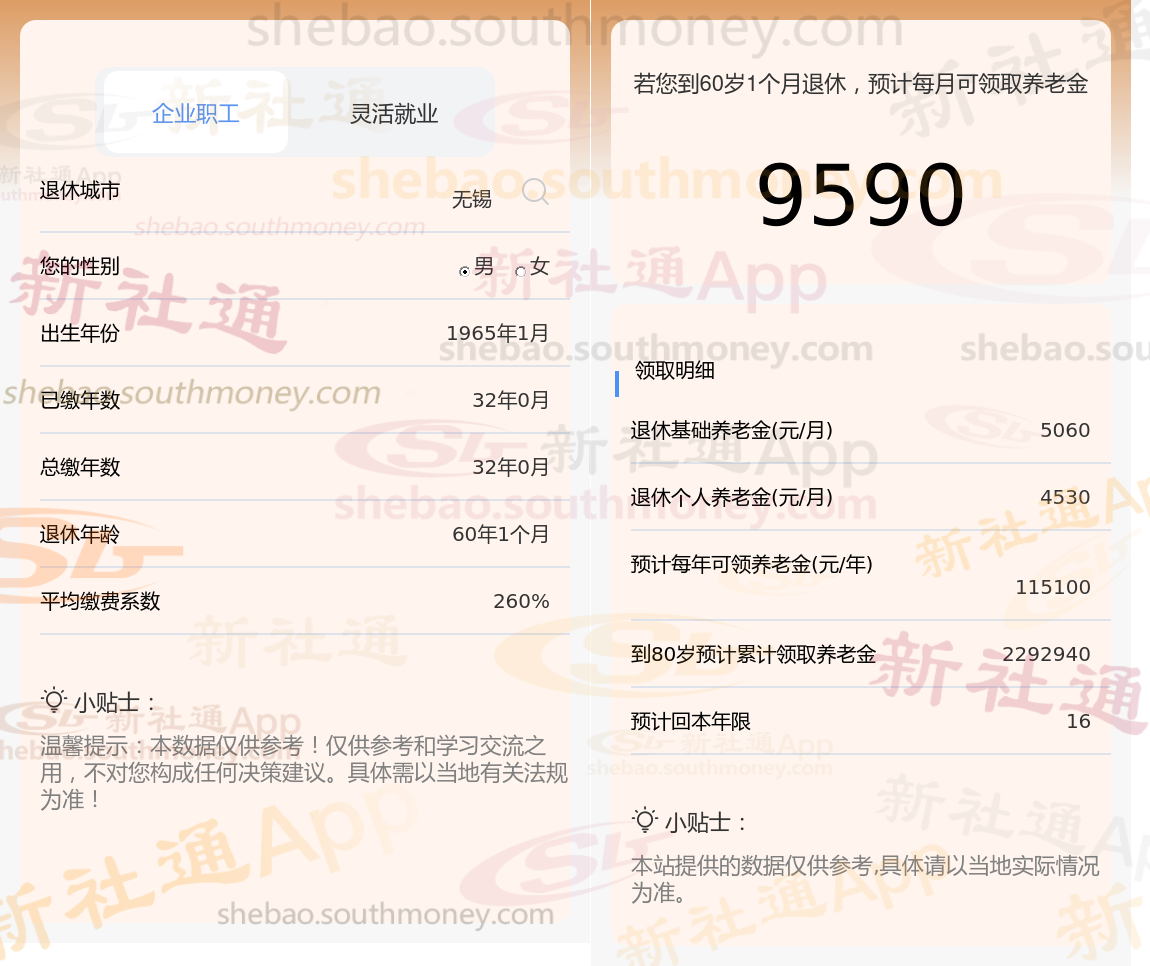 新社通app养老金计算器计算所得: