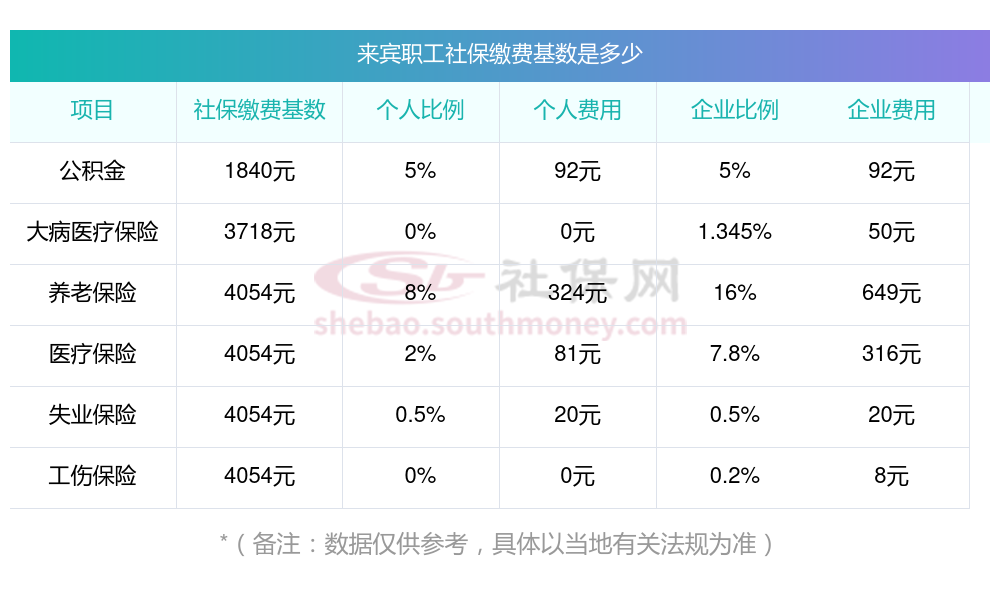 来宾缴费社保比例一览社保公司和个人各交多少?下表是2024-2025年来宾社保费用明细参考,新社通app-社保缴费查询工具提供的最新数据如下: