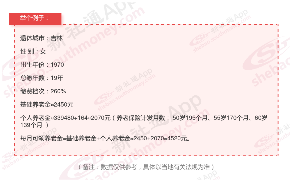 退休城市:吉林,性别:女,出生年份:1970,总缴年数19年,缴费档次:260%,新社通app养老金计算器所得: