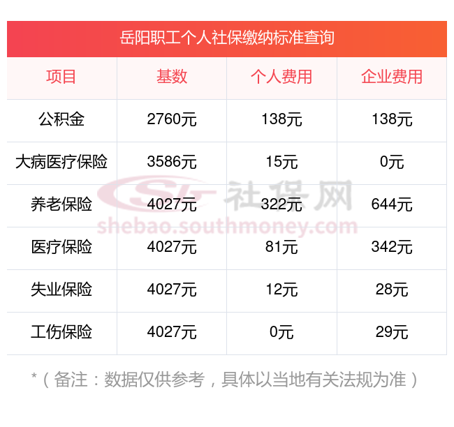 岳阳缴费社保比例一览 社保公司和个人各交多少?下表是2024-2025年岳阳社保费用明细参考,新社通app-社保缴费查询工具提供的最新数据如下: