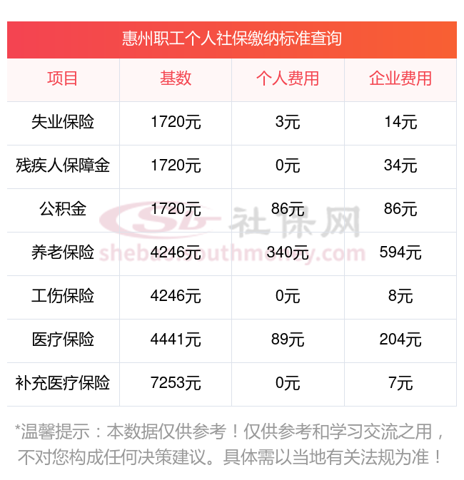 广东社保个人怎么交费?下表是2024-2025年惠州社保费用明细参考,新社通app-社保缴费查询工具提供的最新数据如下: