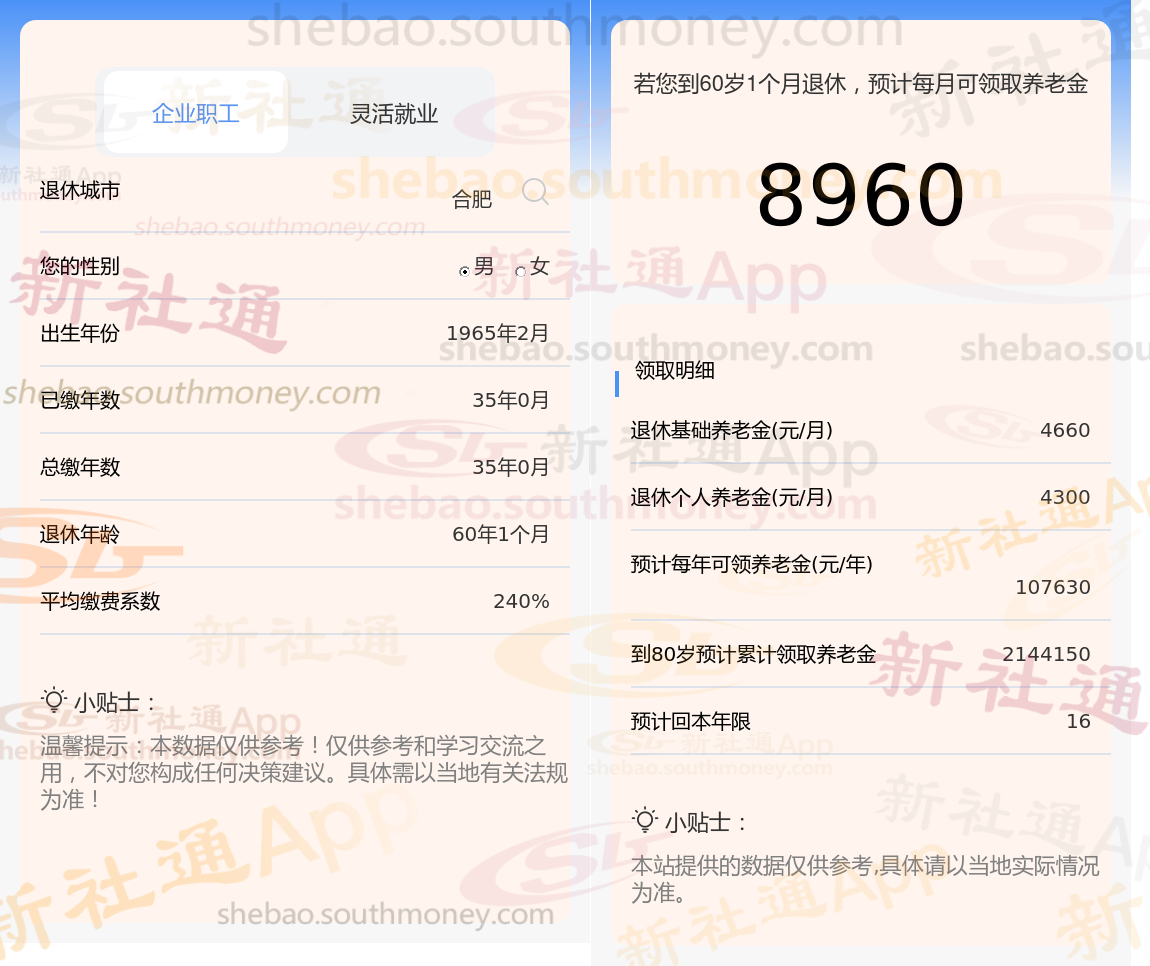个人基础信息:男性,1965年出生,合肥退休人士,拥有35年的缴费年限,缴费档次为240%。