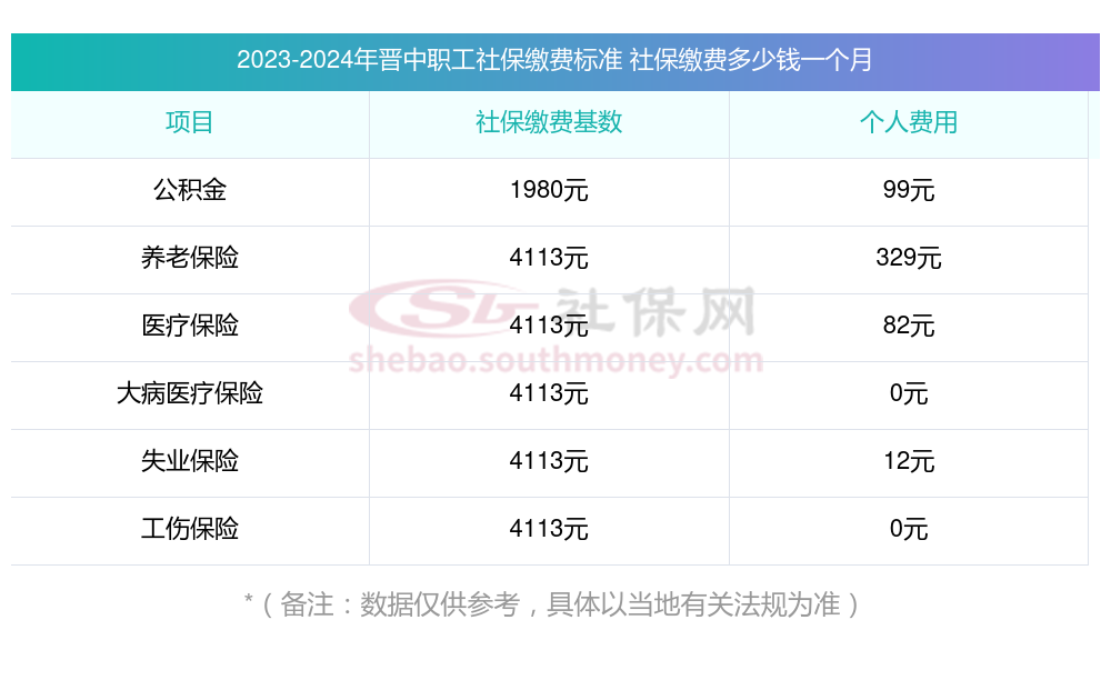 单位员工五险一个月交多少钱 公司加个人是多少?下表是2024-2025年晋中社保费用明细参考,新社通app-社保缴费查询工具提供的最新数据如下: