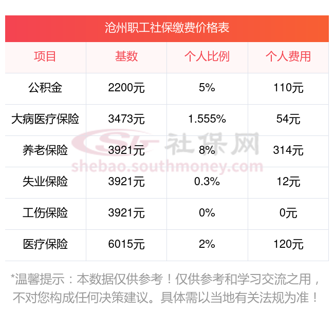 沧州缴费社保比例一览 社保公司和个人各交多少?下表是2024-2025年沧州社保费用明细参考,新社通app-社保缴费查询工具提供的最新数据如下: