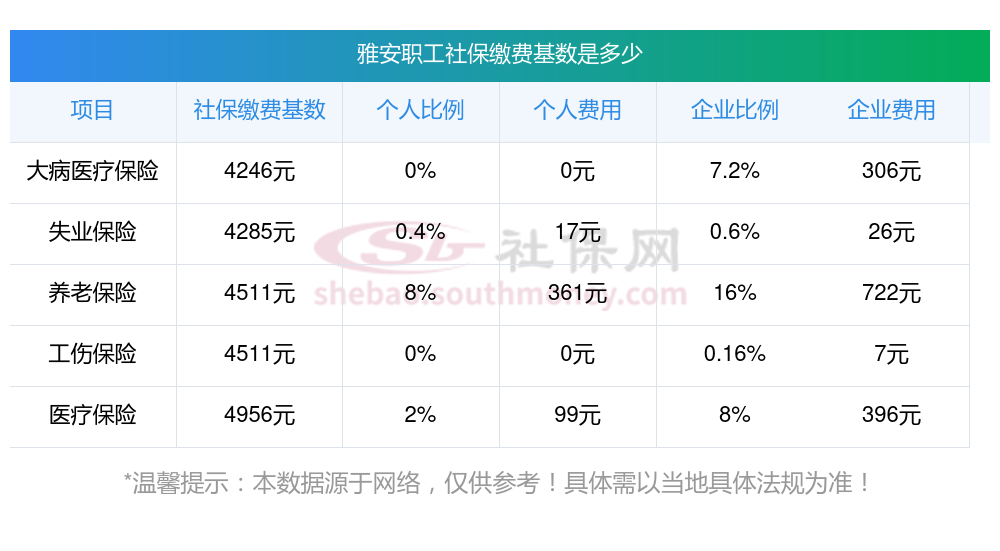 雅安的社保缴费情况,依据2025年最新的缴费标准,我们可以详细地进行如下说明。这些标准是根据新社通app-社保缴费查询工具提供的数据整理得出的: