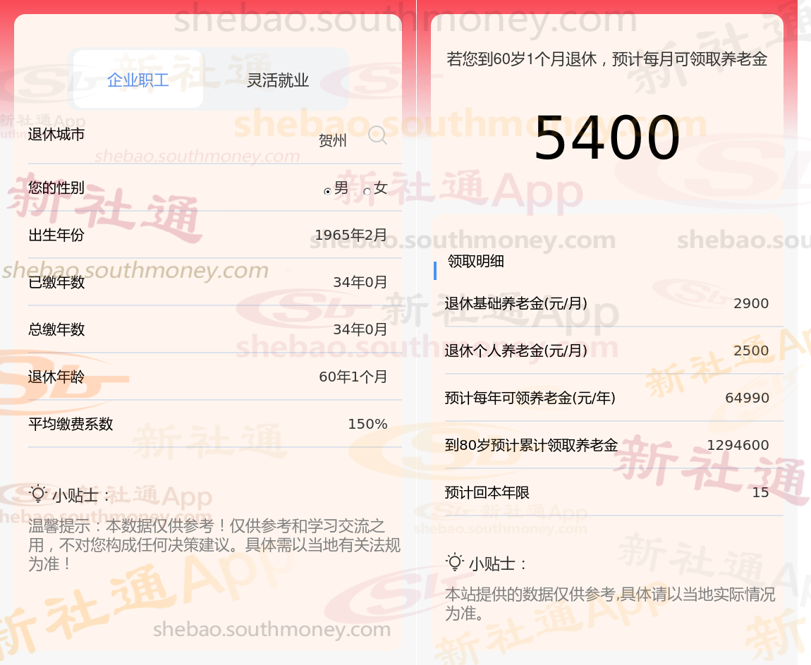 社保按150%档次缴费的王某,贺州城市退休,出生于1965年,工龄34年,男性。岁月流转,他终于迎来了自己的退休年龄。根据新社通app养老金在线计算器计算所得: