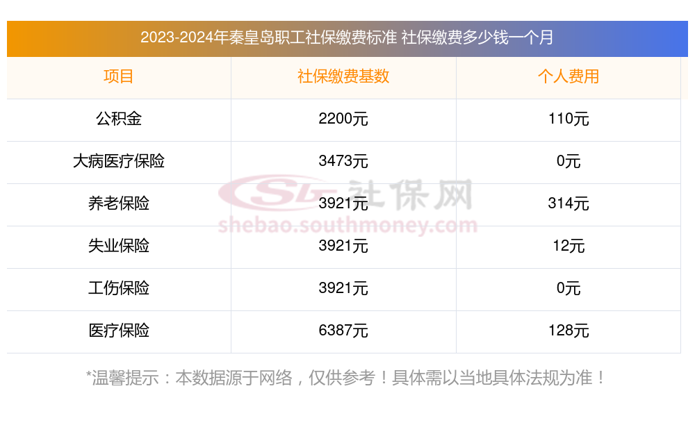 2025年秦皇岛社保缴费多少钱?下表是2023-2024年秦皇岛社保费用明细参考,新社通app-社保缴费查询工具提供的最新数据如下: