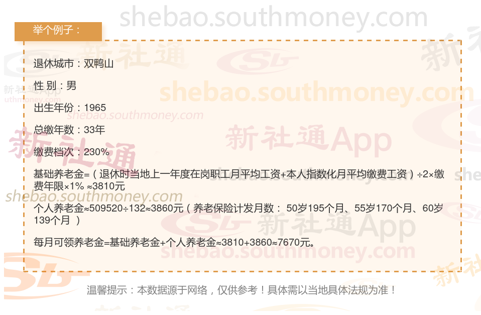 那么社保缴纳33年,能领多少退休金?下面跟着新社君一起来看看例子: