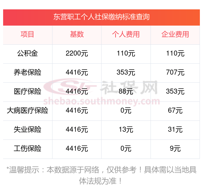和新社丫丫一起来了解下:东营五险一金交多少钱一个月怎么算?2024-2025年东营社保费用明细参考,新社通app-社保缴费查询工具提供的最新数据如下: