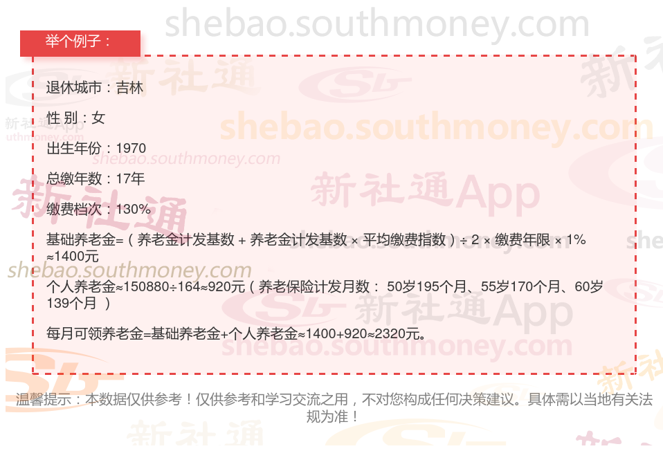 刘某,退休地吉林,出生于1970年,工龄17年,女性,缴费按130%档次。岁月流转,她终于迎来了自己的退休年龄。根据新社通app养老金在线计算器计算所得: