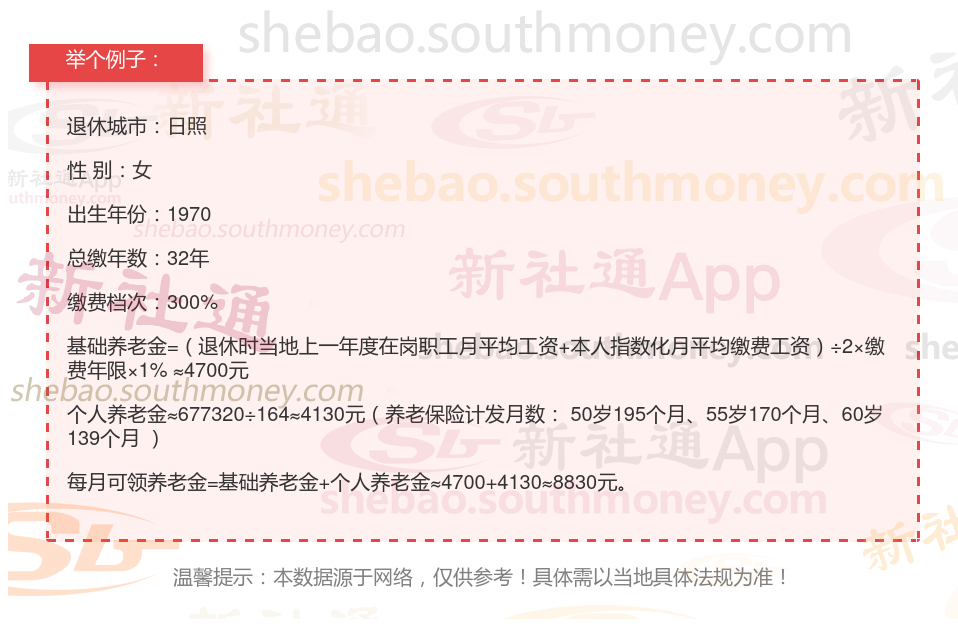 退休城市:日照,性别:女,出生年份:1970,总缴年数32年,缴费档次:300%,新社通app养老金计算器所得: