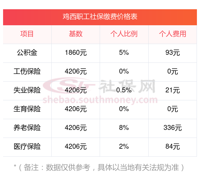 单位员工五险一个月交多少钱 公司加个人是多少?下表是2024-2025年鸡西社保费用明细参考,新社通app-社保缴费查询工具提供的最新数据如下: